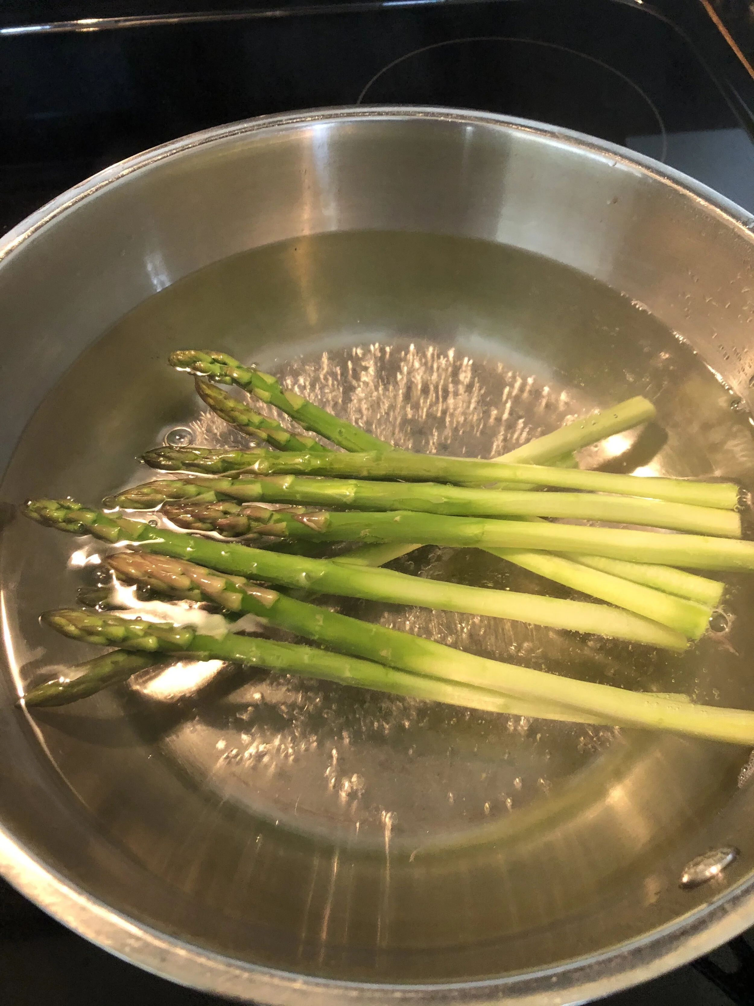 Cook asparagus a little less than 1 minute for this size of asparagus in the picture. If it’s thicker, extend the cooking time a bit longer.